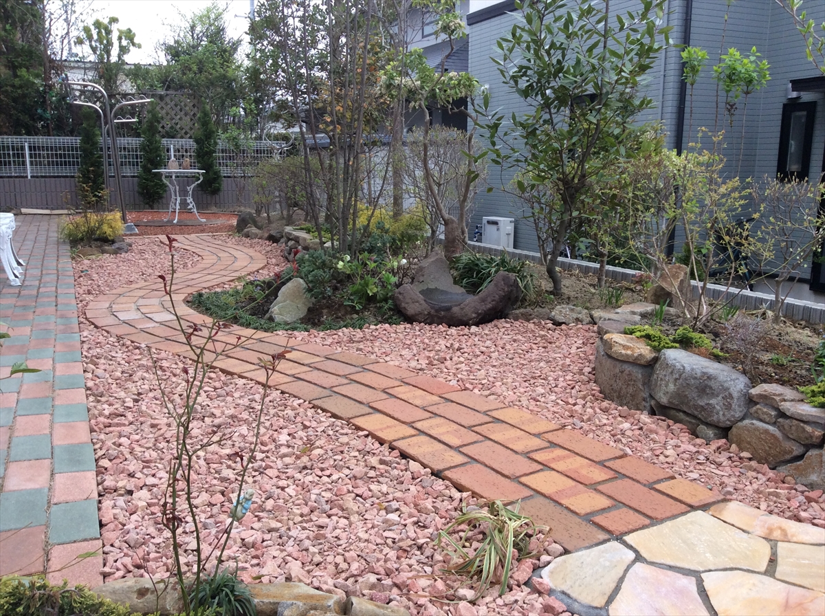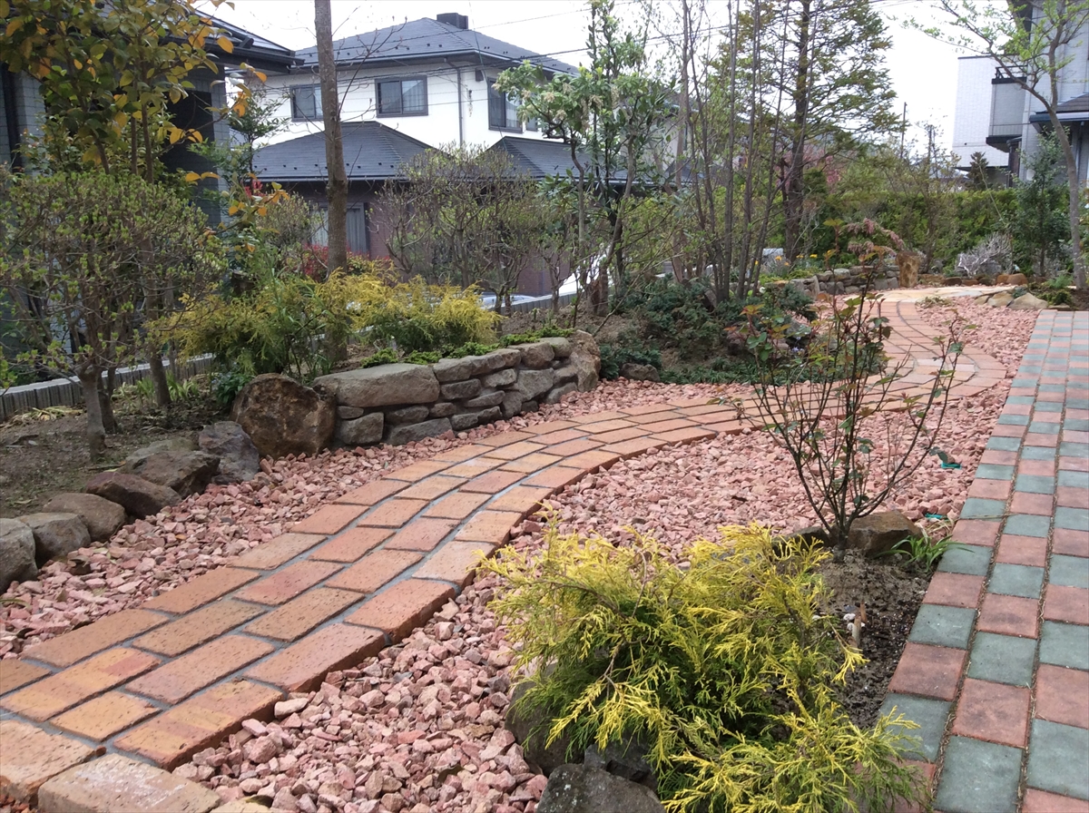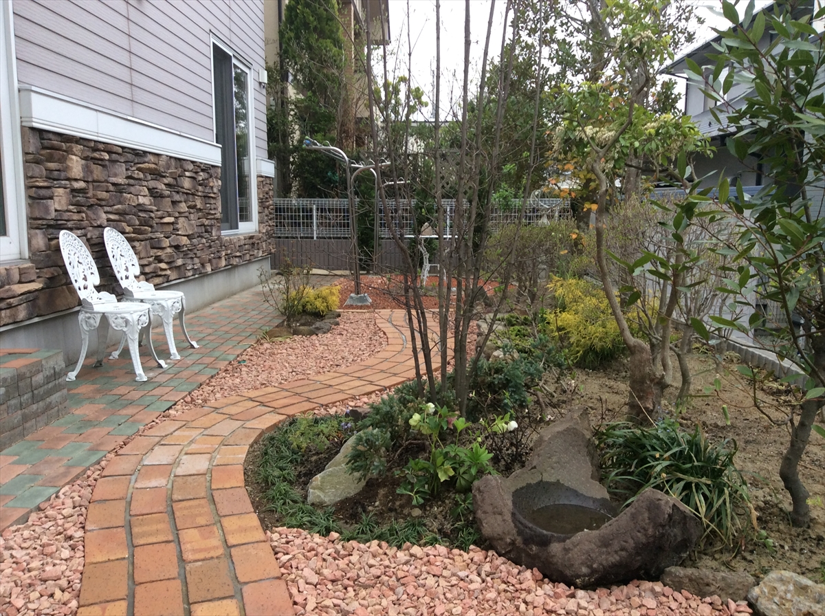 仙台市泉区 T様邸 仙台市泉区 T様邸 芝生メインのお庭から、小道のある手入れのしやすいお庭へのリガーデンのご依頼でした。 レンガの小道を進むと割れた石臼を再利用したバードバスが見えてきます。 雑木の足元にたたずむクリスマスローズの可憐な花に誘われて、どんな小鳥たちがやってくるのか楽しみです。
