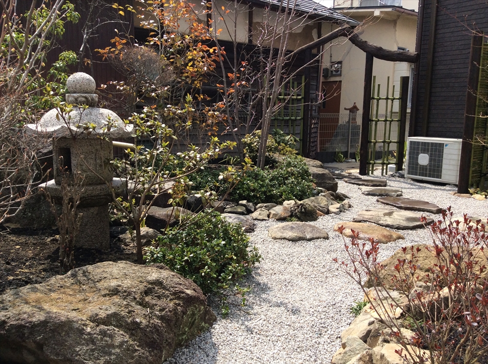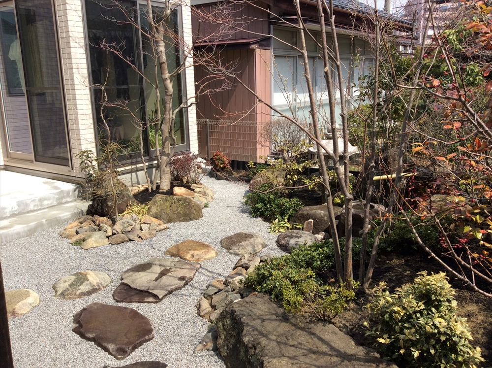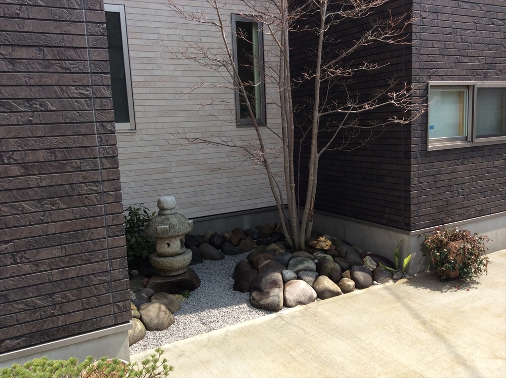 そこに株立ちの雑木を配置して、和風になりすぎず現代の建物と調和するお庭になりました。