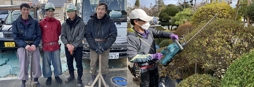 | 仕事内容 | 造園に関わる設計、施工業務 【主な仕事内容】 住宅メーカー発注の植栽工事 個人邸宅の庭づくりと庭の手入れ 大規模ソーラー発電所の除草(草刈り) 官公庁発注の緑地管理 除草(草刈り)、街路樹剪定、伐採、薬剤散布、花壇管理 等 門松作り(年末のみ) |
